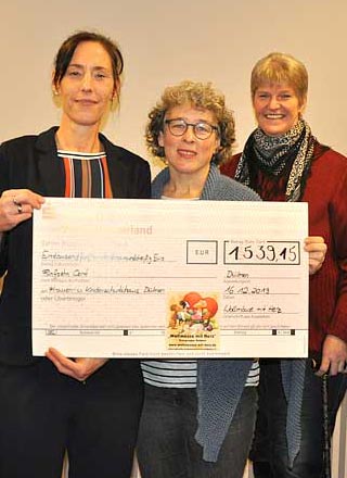 Spendenübergabe am 16.12.2019: Einen Scheck über 1539,15 Euro überreichte Regina Kaute (re.) an Yvonne Schulz-Sicking (li.) und Ismene Dura. © Foto: Hans-Martin Stief (Dülmener Zeitung) |
