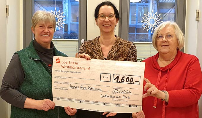 ![]() Ein Scheck über 3.250,00 Euro ging an das Hospiz Anna Katharina Dülmen. Hier soll das Geld u.a. für den Ausbau der Aromapflege für die dort lebenden Gäste verwendet werden. "Wir sind den Wollmäusen mit Herz sehr dankbar, denn wir müssen 5% der Betriebskosten durch Spenden selbst aufbringen und das sind 180.000 Euro pro Jahr", sagte Rabea Brake bei der Scheckübergabe. v.l.n.r.: Rabea Brake (Leiterin Hospiz), Regina Kaute (Vorsitzende Wollmäuse mit Herz) und Anita Ahrens (Wollmäuse mit Herz) |