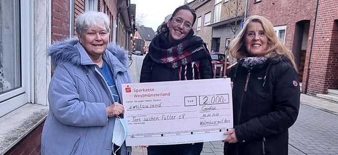 ![]() Ein Scheck über 2.000,00 Euro ging an die Tiertafel "Tiere suchen Futter e.V.". Hier soll das Geld zum einen für Tierarztkosten bei Tieren von Bedürftigen und zum anderen für Spezialfutter für zwei nierenkranke Katzen verwendet werden. v.l.n.r.: Karin Heppe (Schriftführerin Wollmäuse mit Herz), Steffi Bußhoff (1. Vorsitzende Tiere suchen Futter e.V.) und Monika Braun (Kassiererin Wollmäuse mit Herz) |