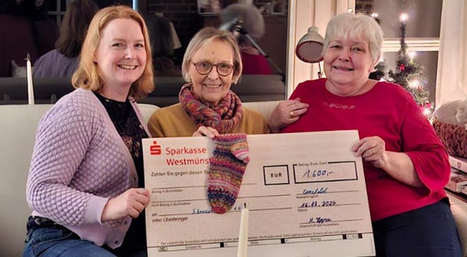 ![]() Ein Scheck über 2.000,00 Euro ging an die Tiertafel "Tiere suchen Futter e.V.". Hier soll das Geld zum einen für Tierarztkosten bei Tieren von Bedürftigen und zum anderen für Spezialfutter für zwei nierenkranke Katzen verwendet werden. v.l.n.r.: Karin Heppe (Schriftführerin Wollmäuse mit Herz), Steffi Bußhoff (1. Vorsitzende Tiere suchen Futter e.V.) und Monika Braun (Kassiererin Wollmäuse mit Herz) |